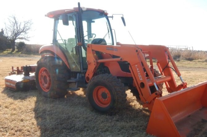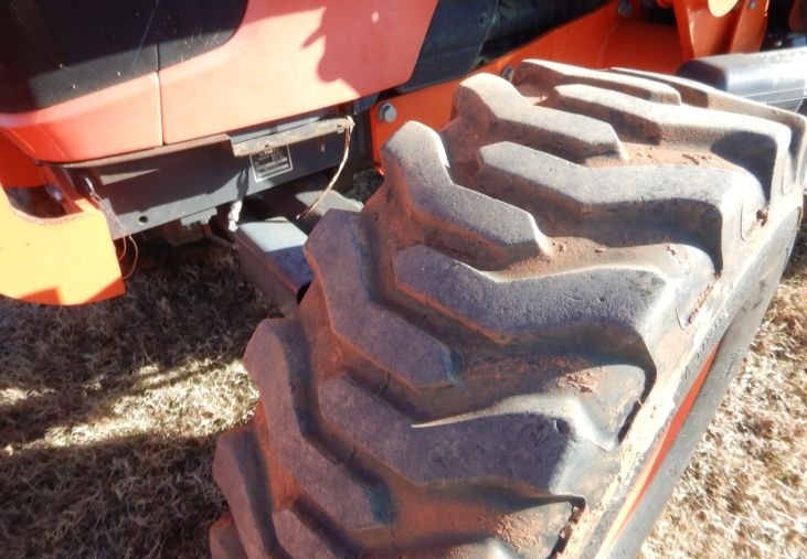 Engine Kubota V3303-DI Displacement: 3.3L Cylinders: 4 Fuel type: Diesel HP: 67 Transmission Shuttle shift 8F - 8R Operators station AC, Heat Operational PTO: 540 Three point Seven pin outlet Hydraulic remote sets Rear: 2 Loader Kubota LA1153 Controls: Joystick Bucket Width: 84" Rhino Turbo 96 rotary mower Width: 96" PTO: 540 Tires Front: 9.5-24 Rear: 16.9-24 Wheel weights: 4 Wheelbase: 83"